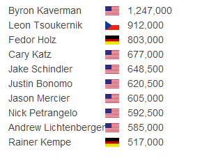Byron Kaverman,2015 GPI年度最佳牌手,此次$300,000超高额豪客碗扑克赛第1轮的筹码量领先者,筹码量为1,247,000,紧随其后的是捷克娱乐场老板Leon Tsoukernik,筹码量为912,000。