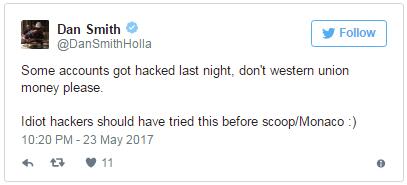 同一天早些时候,Dan Smith的网络账号也被入侵,但他似乎不太在乎,还拿自己在扑克桌的坏运气开玩笑: