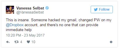 大意:太疯狂了。某人黑了我的Gmail账号,改了我的Dropbox账号密码,没有人能给我提供直接帮助。