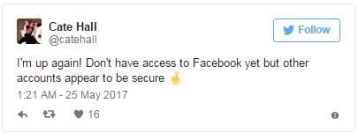 Cate Hall昨天也在推特上说,她的推特和脸书账号都被入侵,但很快就控制了局面。