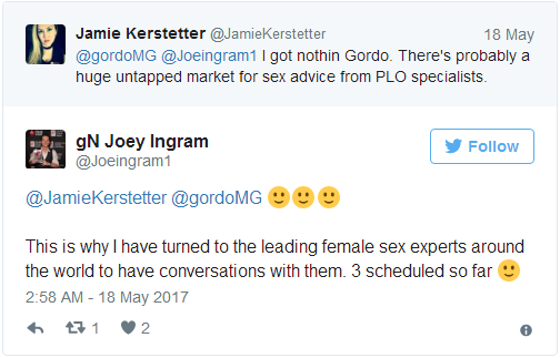 根据Joe Ingram,他称这本书为“男人与女人聊性话题的最佳博弈手册。”消息发布之后,网上与Joe Ingram的互动不断。比如Jamie Kerstetter的推特:我不了解Gordo,也许这本书可以让这位PLO专家多了解一点性。Joe Ingram的回复为:哈哈,这就是为什么我会成为所有女生性顾问专家的原因。