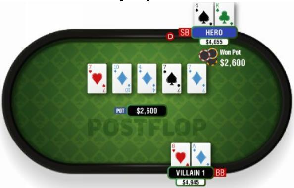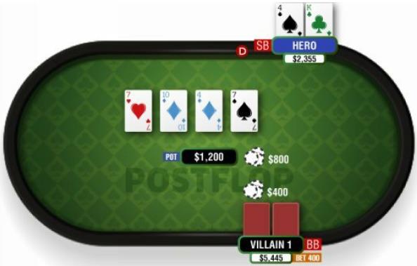 这手牌,我的对手翻前跟注我的加注,翻牌圈跟注我的持续下注,然后在转牌圈做了一个出乎意料的下注。这一局是单挑,我拿着K♣ 4♠,公共牌面是7♥ T♦ 4♦ 7♠:(PS1翻后场景,筹码底池比为6)