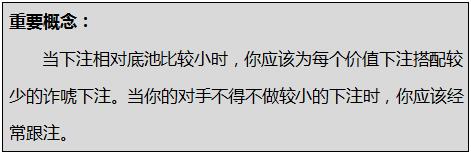 假设不是定额下注,下注者可以选择做最多为有效筹码量的下注。大额下注相对于小额下注多有效?关键是理解正是放大因数使得大额下注更有效。大额下注让下注者得到更多支付,也让他的诈唬更频繁的奏效。
