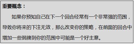 如果你处在下注者的位置,你应该评估自己在前面每个回合用同样方式游戏时多少时候拿着一手强牌,以及你在这种场合多少时候拿着一手诈唬牌。如果你处在跟注者的位置,你的决定比较简单。是否下注者的范围强到你应该放弃所有的抓诈牌?若不是,那么只要用足够多的频率跟注使多余的诈唬无利可图就好。如果你面对一个底池大小下注,那么这意味着50%的时候跟注,或者说用你范围中顶端50%底牌跟注。