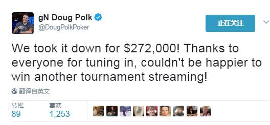 推文大意:我们拿到了272000美元冠军奖金!感谢每一位观众,在直播中再次赢得一场锦标赛真是太高兴了!