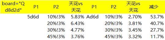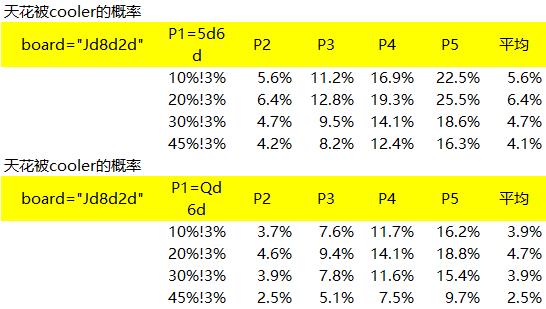 1、 从下面表里我们可以看到,持有5d6d而击中天花的时候,被cooler(遇到更大的天花)的概率基本等于遇到天花的概率