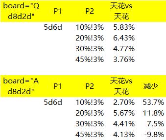 自己的手牌是Ad6d(有A花在手牌中)相比5d6d,一名对手有天花的概率根据范围从紧到松分别减少了53.7%到11.7%不等: