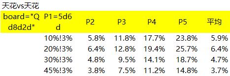 持有5d6d这么一手牌,如果面对对手为平均范围为10%!3%的紧手,通常每多一个对手,在自己击中天花的时候至少有一名对手也击中天花的概率增加5.9%——当处于翻后5人底池的时候,至少有一名对手也击中天花的概率为23.8%。一般而言,都是紧手的情况下不大可能出现翻后5人底池,但是这个结果对于我们是有参考意义的。