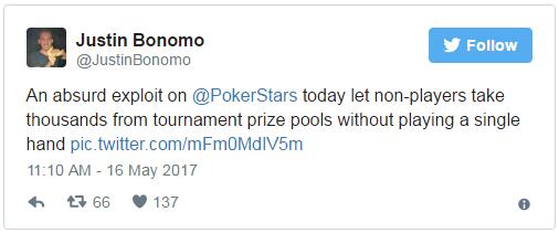 推文大意:扑克之星今天的一个愚蠢的漏洞让非玩家一手牌没打就从锦标赛奖金池中赚到成千上万的资金。