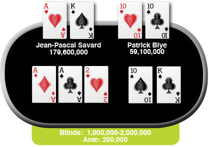 这是PartyPoker百万赛北美站主赛事中的一手牌。当时主赛事只剩下9名选手,再淘汰1名选手将开始决赛桌的角逐。盲注100万/200万,前注20万。翻前,Jean-Pascal Savard在枪口位置加注到600万,他后面的Patrick Blye迅速跟注,其他玩家都弃牌。