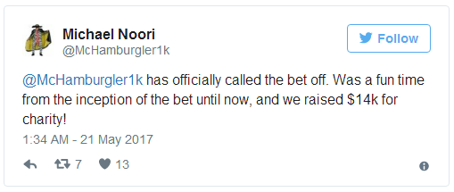 大多数听说这件事的人似乎都认为不可能,最终的结果证明大多数人是正确的。事实上,Mike Noori也没对自己抱多大希望,他知道自己这项垃圾食品的赌注是自找麻烦。早前Jimmy Fricke就通过推特表示这根本不可能完成!