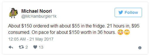 5月21日,他发的第一条推特内容为:又点了$150的食物,冰箱里还有$55的食物。21个小时过去了,我只吃了$95的食物。
