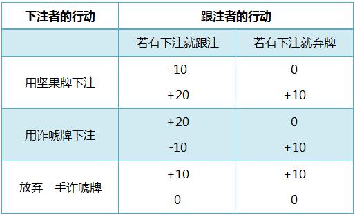 上面的表格显示了所有收益,但其意义和其他游戏中的收益表稍有不同。下注者不能选择任何行。如果下注者拿着一手诈唬牌,他只能在最下两行(下注或弃牌)中做出选择。