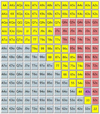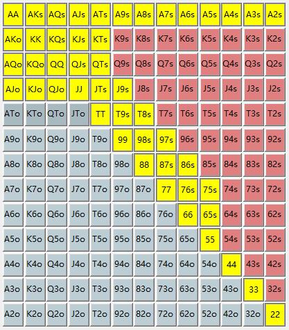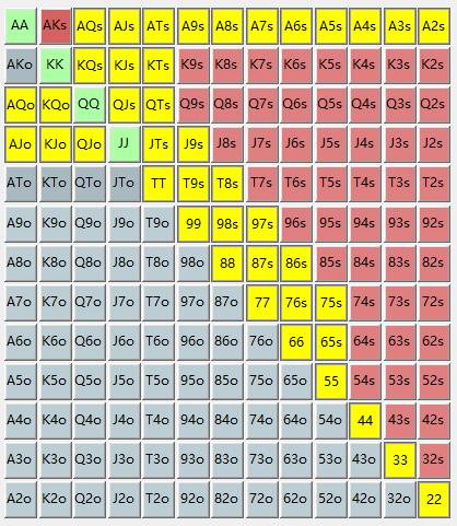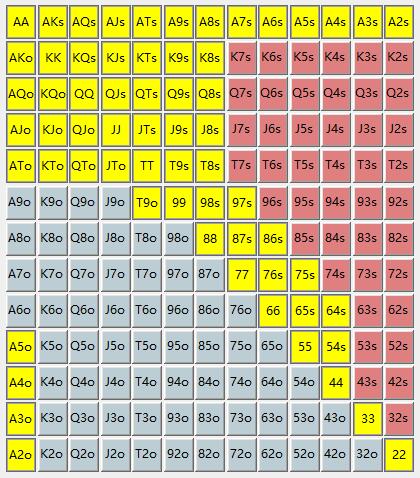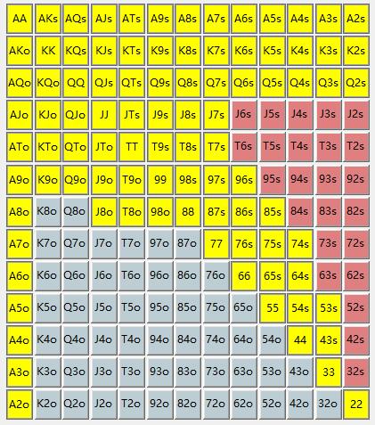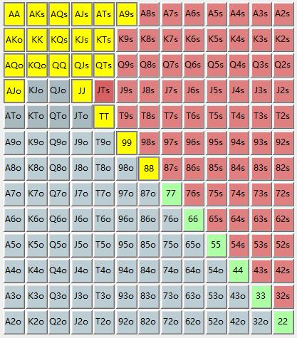 在上述牌例中,假设BTN玩家在翻牌会用Set、顶两对、抽花跟注并如牌例中的路线行动到河牌,并暂时假设BTN玩家的翻牌前跟注范围是大约20%去除顶端3%的牌,经过调整范围表达为:TT-22,AQs-A2s,KTs+,QTs+,J9s+,T8s+,97s+,86s+,75s+,65s,AQo-AJo,KJo+,QJo