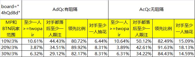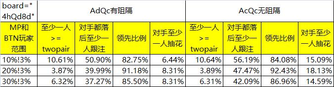 2、 对手范围越紧,Ad这张阻隔牌阻隔掉的抽花数量越多,减少了对手抽花的组合的43%以上(1-8.31/15.59);但是由于抽花占响应行动的比例其实不高,这里没抽花阻隔,对于Hero来说不会增加很多价值范围;