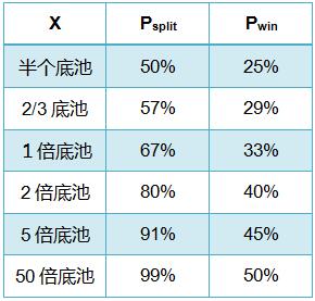 我们可以归纳这个结果。假设对手下注底池大小的X倍,设Psplit为你必须跟注正确的概率,也就是你平分底池的概率。与之相比,设Pwin为你必须跟注正确的概率,也就是你抓诈唬成功的概率。
