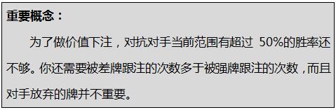 例1:我们河牌圈处在有利位置,考虑在20美元的底池下注10美元。我们的牌70%的时候领先,但我们下注时只在50%的时候得到跟注,包括30%我们落后的时候。