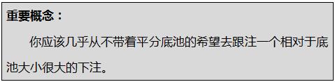 为了平分底池跟注一个半个底池大小的下注需要恰好50%的时候正确才能盈亏平衡,超过了你为了取胜跟注一个大额超池下注所需要的成功率。为了平分池而跟注一个很大的超池下注,你可能需要几乎所有时候都跟注正确。