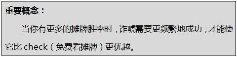 作为另一种计算方法,你可以说,相比check,成功的诈唬赚到了160美元,而不成功的诈唬损失了190美元,因此你需要在190/(190 + 160) = 54%的时候诈唬成功。