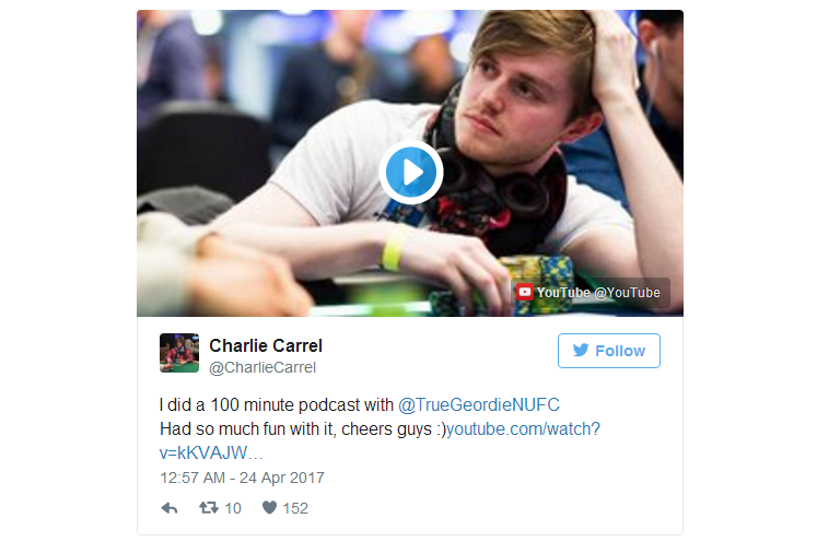 了解Charlie Carrel的人都知道他是靠10英镑起家的,以一个绝佳的状态进入线上牌场,随后便在牌坛一发不可收拾,他自己也曾说扑克是他的出路。