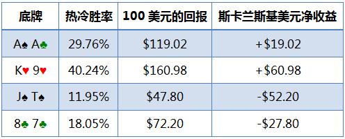 许多牌手只在他们输掉底池时才考虑斯卡兰斯基美元。当他们用QQ全压对抗JJ输了时,他们就想到了他们赢得的斯卡兰斯基美元与真实损失之间的差异。当牌手们认为他们没有得到应得的回报时,其结果是挫败感和情绪失控。牌手们往往忽略了他们赢得超过斯卡兰斯美元的真实收益的次数。他们严重高估了他们赚到的斯卡兰斯基美元。把你的钱投入在最好的牌上并不意味着你应该赢下整个底池。长期而言,你的扑克结果将接近于你赚到的斯卡兰斯基美元,但你的统计必须包括你交上好运的时候。