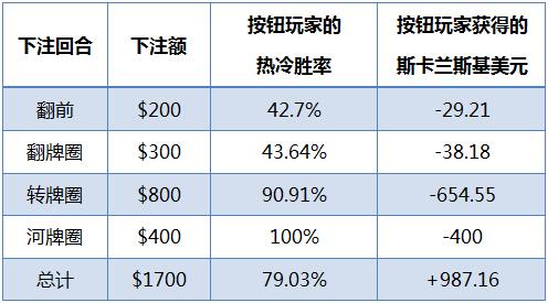 大盲玩家的斯卡兰斯基美元收益与按钮玩家恰好相反。例如,大盲玩家在翻前赚到了29.21斯卡兰斯基美元。