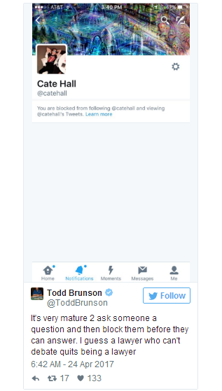 不久之后Cate Hall又拉黑了Todd Brunson,传奇牌手Doyle Brunson的儿子,他自己发推特宣布了被拉黑的消息。