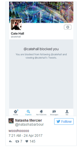 本周在没有任何迹象的情况下Cate Hall在推特上直接拉黑了Natasha Mercier和Todd Brunson。