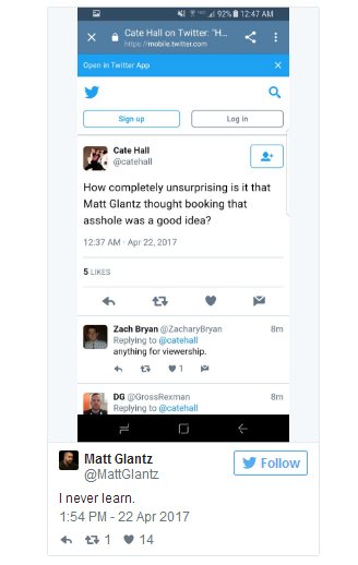 Cate Hall推特大意:不用猜,Matt Glantz就是一个混球。