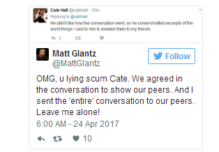 Matt Glantz推特大意:上帝!Cate Hall你就是个骗子。你怎么不能跟我好好交流了?还是你滚吧,越远越好!