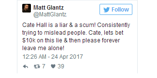 Matt Glantz推特大意:Cate Hall满口假话,就是个人渣!一直都在误导大众,Cate Hall你怼我,我就跟你杠到底!