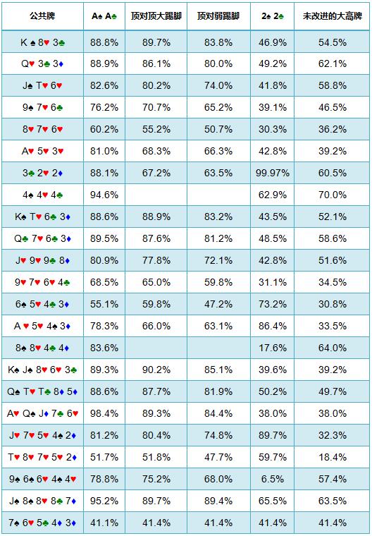 像KQ这样未改进的高牌在对抗一手随机牌时,通常公共牌有一张A要比公共牌没有A更好。如果某人拿着一张A,KQ很难翻盘顶对,但Ax已经领先于KQ,取胜不需要再来一张A,因此KQ对抗Ax的代价比较小。公共牌的A使得开始落后于KQ的牌更难翻盘。因此,未改进的KQ在包含一张A的翻牌面对抗一手随机牌的胜率只比AK在一个小牌翻牌面的胜率差一点。在河牌圈,未改进KQ在A高公共牌面对抗一手随机牌的胜率比AK在小牌公共牌面对抗一手随机牌稍好,而且QJ在A-K-x-x-x公共牌面对抗一个起手牌不讲究的牌手结果惊人的好。如果你用未改进的Jx牌在A-A-K-x-x公共牌面跟注,许多牌手的吃惊程度甚至超过了你用K高牌在小牌公共牌面跟注,即使前者对抗一手随机牌更强。