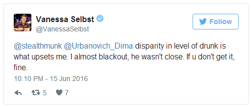 Jason Mercier在取得第二条金手链之后,Vanessa Selbst就开始坐不住了,她随即发推特表示自己当时喝多了,在没有认真思考的情况下就决定了这场赌注,字里行间有点想不认账的感觉,但Jason Mercier却没有妥协的意思。