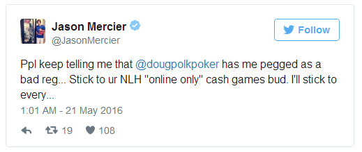 众所周知,Jason Mercier是一名非常出色的职业牌手,在小型系列赛事中的累积奖金就已突破1800万美元,但Doug Polk却曾公开评价Jason Mercier的牌技“很一般”。对此Jason Mercier也通过推特进行了严厉的回击。