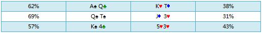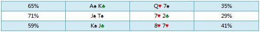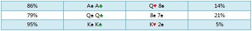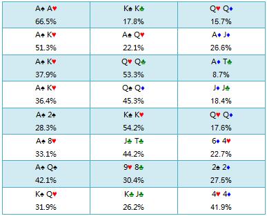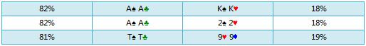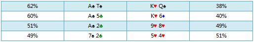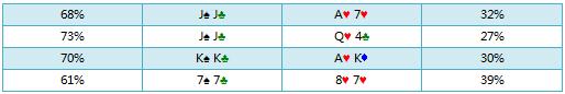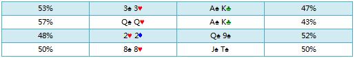 所有双高牌和低对的对决都是旗鼓相当的,通常被称作“掷币对决”,虽然它们的对决通常并不恰好是50:50。