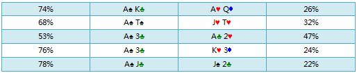 对这种情况的误解导致许多人高估了A2这样的弱A牌的价值。这手牌经常稍稍领先,但只有对上K2、Q2等牌才有明显优势,而对抗任何口袋对子及A8+都处于大下风。这有助于解释为何A2对抗由最好50%起手牌组成的范围处于下风。22因为类似的原因也是如此。