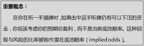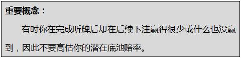 听牌在翻牌圈比在转牌圈更强。对于全压,这种说法是正确的,因为你有两次而不是一次机会。但当你还剩有可下注的资金时,这也是正确的。如果你在转牌圈做成了你的牌,那么你有两次得到支付的机会。两个底池大小下注意味着每个牌手投入了四倍转牌圈底池大小的资金,这可能是你跟注金额的许多倍。如果你在河牌圈做成了你的牌,你只有一次得到支付的机会,因此相对于底池大小而言你赢得比较少。河牌圈击中你的牌后,你通常预计赢得的资金不会超过一个底池大小。