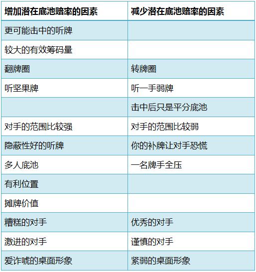 以下是上面讨论的因素会如何影响你的潜在底池赔率的一份明细表: