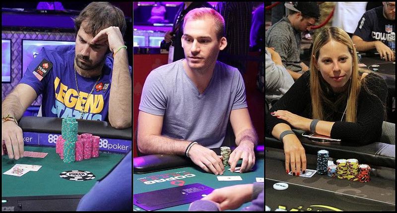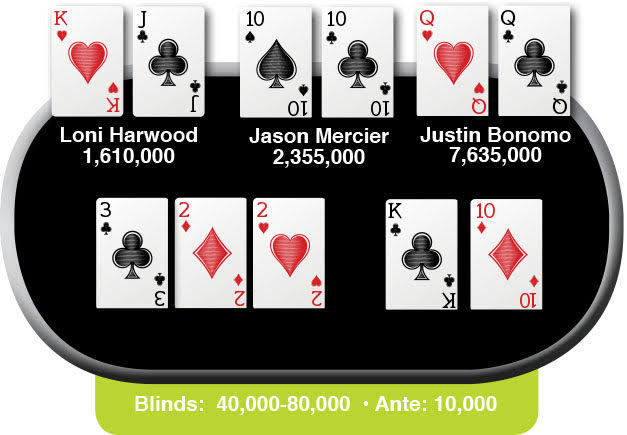坐在大盲位置、比前两名选手筹码多很多的Justin Bonomo秒跟。三人亮牌:Mercier拿着10♠ 10♣,Harwood拿着K♥ J♣,Bonomo拿着Q♥ Q♣。
