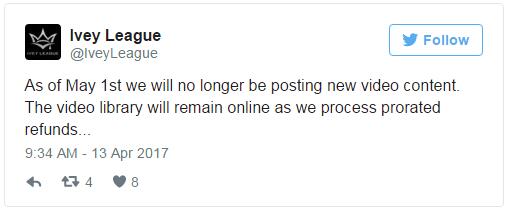 推文大意:从5月1日起,我们(Ivey联盟)将不再上传新的视频内容。视频库将继续保留在网络上,我们也会按比例给会员退款。