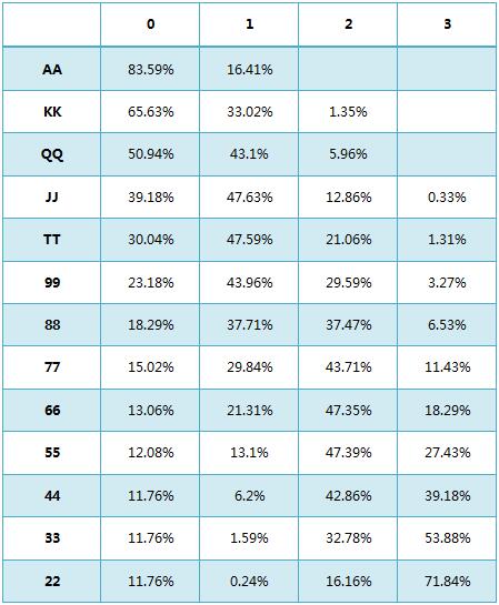 假设你发到了口袋对子88。你通常乐意看到翻牌包括一张8,但在你没有击中暗三条的时候,有些翻牌比其他翻牌更好。我们暂且假定你的主要顾虑是某人拿着一手非对子底牌,其中的危险牌可以在翻牌圈击中好牌反超你。例如,在T-4-4翻牌面,某个拿着JT的牌手已经反超你,拿着A4的牌手也是如此。下面是每个口袋对子在翻牌圈存在0张、1张、2张危险牌的概率。