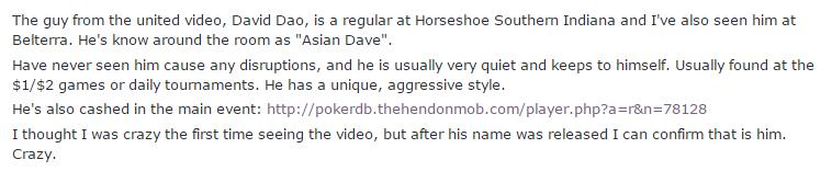 你可能不知道的是,Dao可以说是一名牌手。最近红迪网出现了一个帖子,数名reg玩家在帖子上表示,曾经在南印第安那州马蹄铁赌场多次看到David Dao打现金扑克和扑克锦标赛。扑克室的人都叫他“亚洲人戴夫”(Asian Dave)