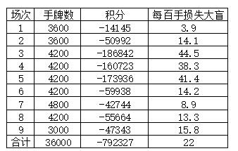 全部36000手牌打完,人类总共输了792327分,平均每百手损失22个大盲注。这个差距在人类牌手之中已经是比较大的了,一般认为每百手超过10个大盲注的战斗就属于大胜。更令人遗憾的是,即使单算九场比赛,龙之队也没有一场能够在总分上超过冷扑大师。