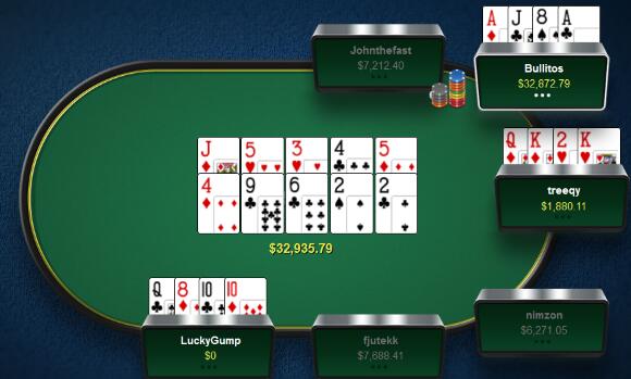 Bullitos在这个翻前三人全压底池自始至终从未落后,第一次发牌他凭借两对取胜,第二次发牌他拿到了A高同花。