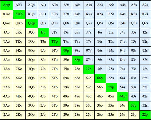 谨记,起手牌表格是为不能正确构建范围的新手以及希望建立某种大致基准的玩家提供的解决方案。随着你的牌技提高,你很少会觉得每一手牌都需要瞟一眼表格。